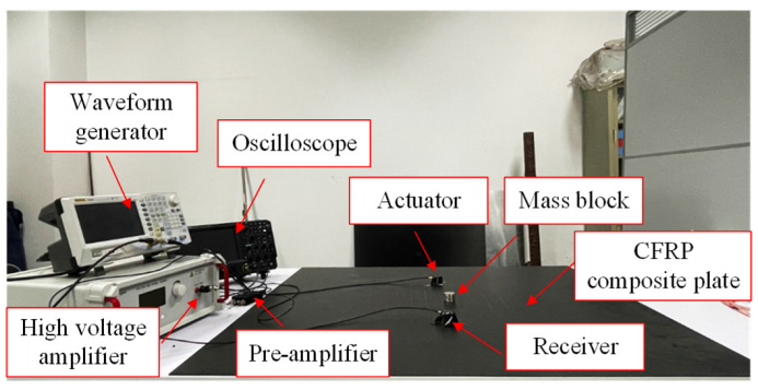 实验设备:ATA-2031高压放大器,任意函数波形发生器、示波器、超声波信号前置放大器、CFRP复合板等。